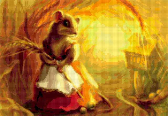 Ориентировочно так, схема вышивки «Колосок», созданная автором avevstigneeva, будет выглядеть при отшиве на канве. Размер данной вышивки равен 190x131 крестов, при этом используется 60 цветов. Ключевые слова, по которым можно найти эту схему: сказка, детям, юмор. Также, вы можете взглянуть на оригинальную картинку, соответствующую данной схеме вышивки.