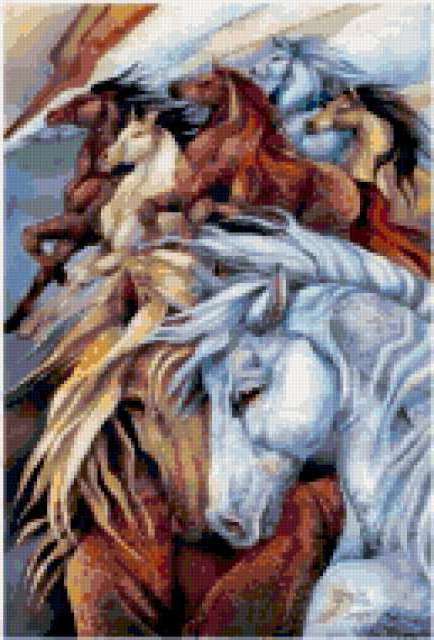 Ориентировочно так, схема вышивки «Кони», созданная автором lv-sunflower, будет выглядеть при отшиве на канве. Размер данной вышивки равен 129x190 крестов, при этом используется 69 цветов. Ключевые слова, по которым можно найти эту схему: конь, лошадь, животные. Также, вы можете взглянуть на оригинальную картинку, соответствующую данной схеме вышивки.