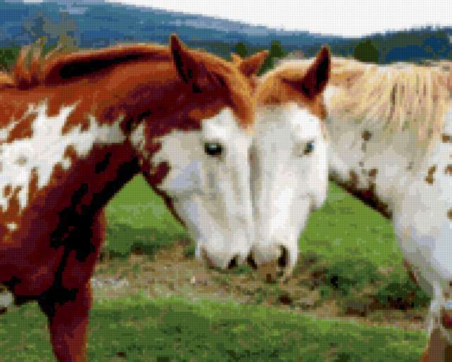 Ориентировочно так, схема вышивки «Кони», созданная автором Karel, будет выглядеть при отшиве на канве. Размер данной вышивки равен 190x152 крестов, при этом используется 74 цветов. Ключевые слова, по которым можно найти эту схему: конь, лошадь, животные. Также, вы можете взглянуть на оригинальную картинку, соответствующую данной схеме вышивки.