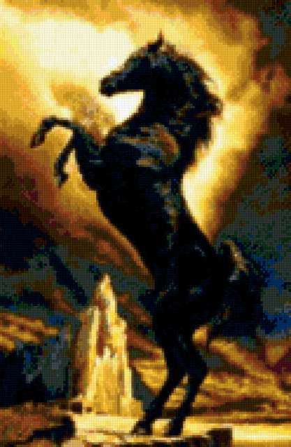 Ориентировочно так, схема вышивки «Конь», созданная автором GOGI, будет выглядеть при отшиве на канве. Размер данной вышивки равен 124x190 крестов, при этом используется 60 цветов. К несчастью, автор не назначил для схемы ключевые слова. Также, вы можете взглянуть на оригинальную картинку, соответствующую данной схеме вышивки.