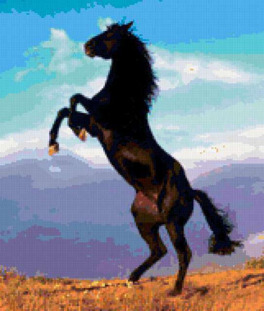 Ориентировочно так, схема вышивки «Конь», созданная автором Svetla_Nochka, будет выглядеть при отшиве на канве. Размер данной вышивки равен 161x190 крестов, при этом используется 59 цветов. Ключевые слова, по которым можно найти эту схему: конь, картина, пейзаж, природа, черное, белое, растения, цветы, животные, небо, конь.. Также, вы можете взглянуть на оригинальную картинку, соответствующую данной схеме вышивки.