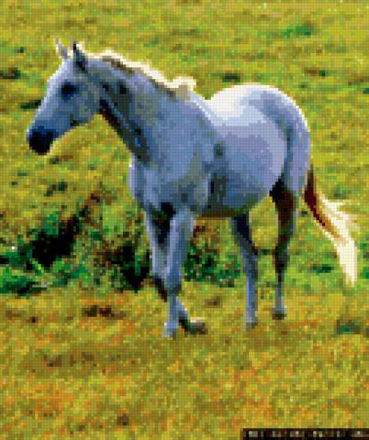 Ориентировочно так, схема вышивки «Конь», созданная автором irada68, будет выглядеть при отшиве на канве. Размер данной вышивки равен 126x150 крестов, при этом используется 55 цветов. Ключевые слова, по которым можно найти эту схему: конь, лошадь, животные. Также, вы можете взглянуть на оригинальную картинку, соответствующую данной схеме вышивки.