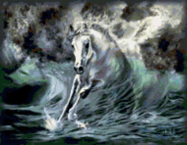 Ориентировочно так, схема вышивки «Конь», созданная автором asyacleverblondi, будет выглядеть при отшиве на канве. Размер данной вышивки равен 190x148 крестов, при этом используется 54 цветов. Ключевые слова, по которым можно найти эту схему: конь, лошадь, животные. Также, вы можете взглянуть на оригинальную картинку, соответствующую данной схеме вышивки.