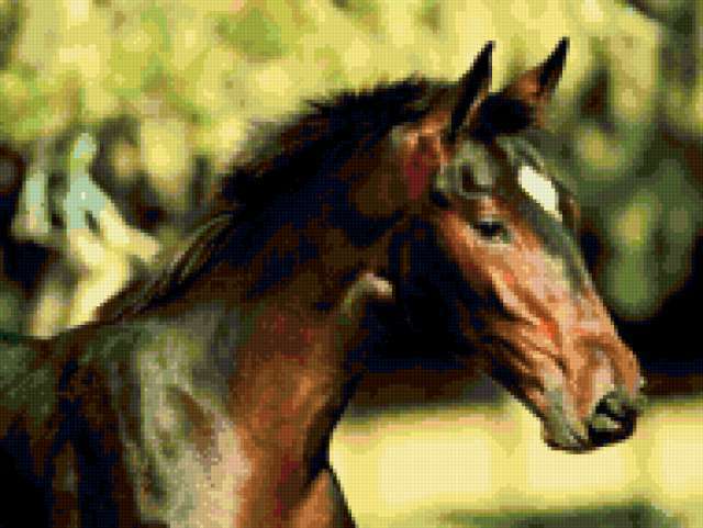 Ориентировочно так, схема вышивки «Конь», созданная автором Karel, будет выглядеть при отшиве на канве. Размер данной вышивки равен 190x143 крестов, при этом используется 63 цветов. Ключевые слова, по которым можно найти эту схему: конь, лошадь, животные. Также, вы можете взглянуть на оригинальную картинку, соответствующую данной схеме вышивки.