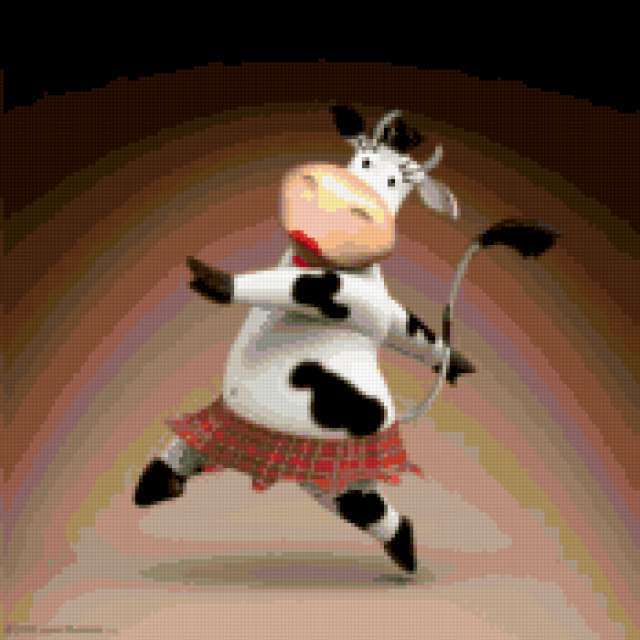 Ориентировочно так, схема вышивки «Корова», созданная автором Lara10kl, будет выглядеть при отшиве на канве. Размер данной вышивки равен 175x175 крестов, при этом используется 55 цветов. Ключевые слова, по которым можно найти эту схему: корова. Также, вы можете взглянуть на оригинальную картинку, соответствующую данной схеме вышивки.