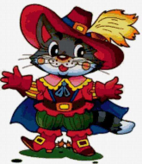 Ориентировочно так, схема вышивки «Кот в сапогах», созданная автором zima68, будет выглядеть при отшиве на канве. Размер данной вышивки равен 165x190 крестов, при этом используется 67 цветов. Ключевые слова, по которым можно найти эту схему: для детей.картина.кот.сказка. Также, вы можете взглянуть на оригинальную картинку, соответствующую данной схеме вышивки.