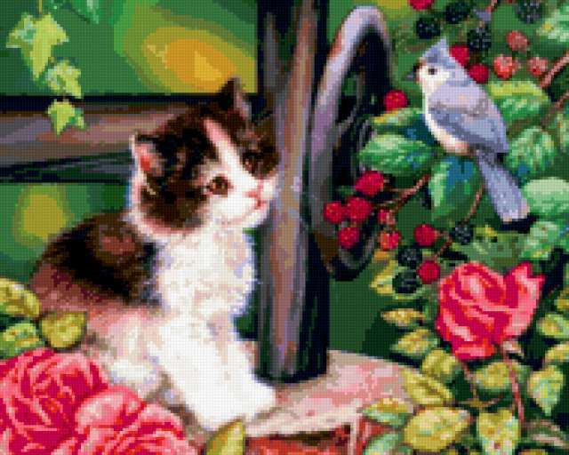 Ориентировочно так, схема вышивки «Котенок», созданная автором Tinna, будет выглядеть при отшиве на канве. Размер данной вышивки равен 190x152 крестов, при этом используется 84 цветов. Ключевые слова, по которым можно найти эту схему: котенок. Также, вы можете взглянуть на оригинальную картинку, соответствующую данной схеме вышивки.