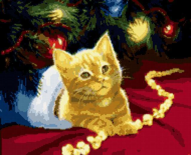 Ориентировочно так, схема вышивки «Котик», созданная автором svkoba, будет выглядеть при отшиве на канве. Размер данной вышивки равен 190x155 крестов, при этом используется 40 цветов. Ключевые слова, по которым можно найти эту схему: кошки, животные. Также, вы можете взглянуть на оригинальную картинку, соответствующую данной схеме вышивки.