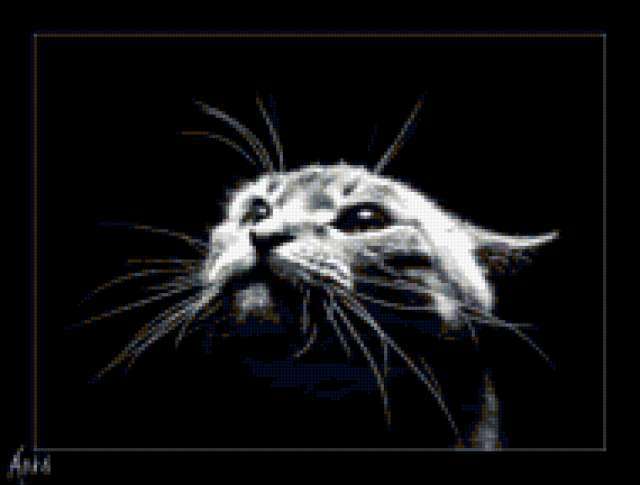 Ориентировочно так, схема вышивки «Котофей», созданная автором Buzz, будет выглядеть при отшиве на канве. Размер данной вышивки равен 190x144 крестов, при этом используется 16 цветов. Ключевые слова, по которым можно найти эту схему: кот, черно-белое. Также, вы можете взглянуть на оригинальную картинку, соответствующую данной схеме вышивки.