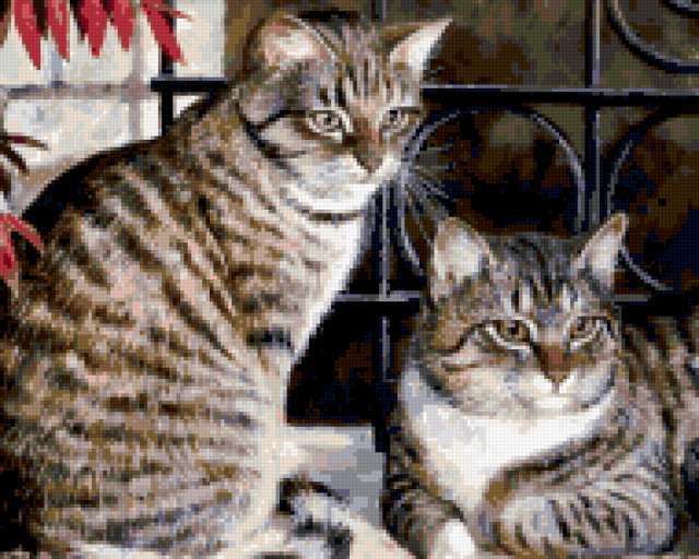 Ориентировочно так, схема вышивки «Коты», созданная автором zarevna, будет выглядеть при отшиве на канве. Размер данной вышивки равен 190x152 крестов, при этом используется 41 цветов. Ключевые слова, по которым можно найти эту схему: картина, кошки, разное. Также, вы можете взглянуть на оригинальную картинку, соответствующую данной схеме вышивки.