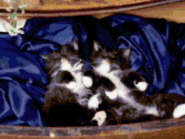 Ориентировочно так, схема вышивки «Котята», созданная автором patutina, будет выглядеть при отшиве на канве. Размер данной вышивки равен 190x143 крестов, при этом используется 56 цветов. Ключевые слова, по которым можно найти эту схему: природа, животные, кошки, котята. Также, вы можете взглянуть на оригинальную картинку, соответствующую данной схеме вышивки.