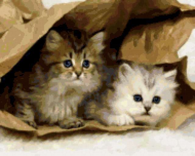 Ориентировочно так, схема вышивки «Котята», созданная автором burova, будет выглядеть при отшиве на канве. Размер данной вышивки равен 190x152 крестов, при этом используется 56 цветов. Ключевые слова, по которым можно найти эту схему: котята, кошки, животные. Также, вы можете взглянуть на оригинальную картинку, соответствующую данной схеме вышивки.