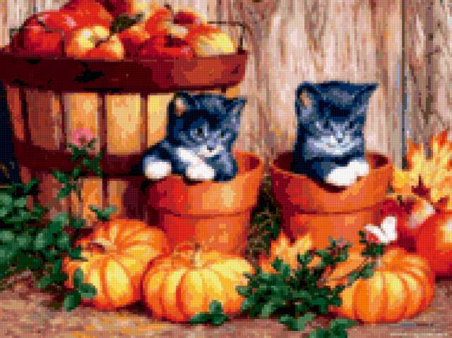 Ориентировочно так, схема вышивки «Котята», созданная автором Olechka-Sun-R, будет выглядеть при отшиве на канве. Размер данной вышивки равен 190x142 крестов, при этом используется 85 цветов. Ключевые слова, по которым можно найти эту схему: котята, кошка, кошки, тыква. Также, вы можете взглянуть на оригинальную картинку, соответствующую данной схеме вышивки.