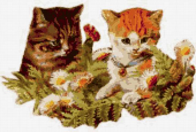 Ориентировочно так, схема вышивки «Котята», созданная автором poltanya, будет выглядеть при отшиве на канве. Размер данной вышивки равен 170x115 крестов, при этом используется 36 цветов. Ключевые слова, по которым можно найти эту схему: котята, ромашки, кошки в цветах, кошки, кошка, коты, животные, малыши, детская картина, детские сюжеты. Также, вы можете взглянуть на оригинальную картинку, соответствующую данной схеме вышивки.