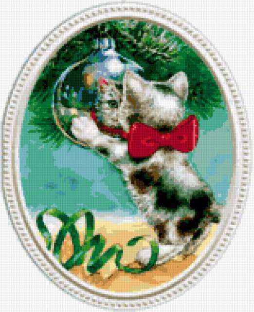 Ориентировочно так, схема вышивки «Котёнок и ёлка», созданная автором poltanya, будет выглядеть при отшиве на канве. Размер данной вышивки равен 155x190 крестов, при этом используется 49 цветов. Ключевые слова, по которым можно найти эту схему: котята, серпантин, котёнок, новогодняя, малыши, игрушки, цветы, ёлка, игрушки, рождество, новый год, детские сюжеты. Также, вы можете взглянуть на оригинальную картинку, соответствующую данной схеме вышивки.