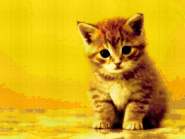 Ориентировочно так, схема вышивки «Котёнок на жёлтом», созданная автором natbor, будет выглядеть при отшиве на канве. Размер данной вышивки равен 190x143 крестов, при этом используется 43 цветов. Ключевые слова, по которым можно найти эту схему: кошки. Также, вы можете взглянуть на оригинальную картинку, соответствующую данной схеме вышивки.