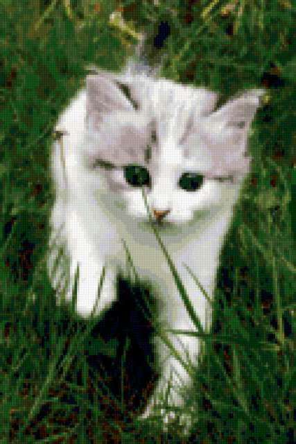 Ориентировочно так, схема вышивки «Котёнок», созданная автором sl202, будет выглядеть при отшиве на канве. Размер данной вышивки равен 127x190 крестов, при этом используется 53 цветов. К несчастью, автор не назначил для схемы ключевые слова. Также, вы можете взглянуть на оригинальную картинку, соответствующую данной схеме вышивки.