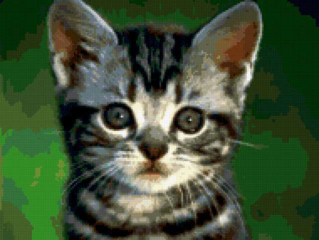 Ориентировочно так, схема вышивки «Котёнок», созданная автором NatalyaKrus, будет выглядеть при отшиве на канве. Размер данной вышивки равен 190x143 крестов, при этом используется 62 цветов. Ключевые слова, по которым можно найти эту схему: котёнок, кошки, животные. Также, вы можете взглянуть на оригинальную картинку, соответствующую данной схеме вышивки.
