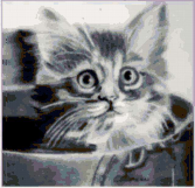 Ориентировочно так, схема вышивки «Котёнок», созданная автором poltanya, будет выглядеть при отшиве на канве. Размер данной вышивки равен 167x161 крестов, при этом используется 25 цветов. Ключевые слова, по которым можно найти эту схему: кошки, котёнок, кошка, коты, кот, животные, котик, кошечки. Также, вы можете взглянуть на оригинальную картинку, соответствующую данной схеме вышивки.