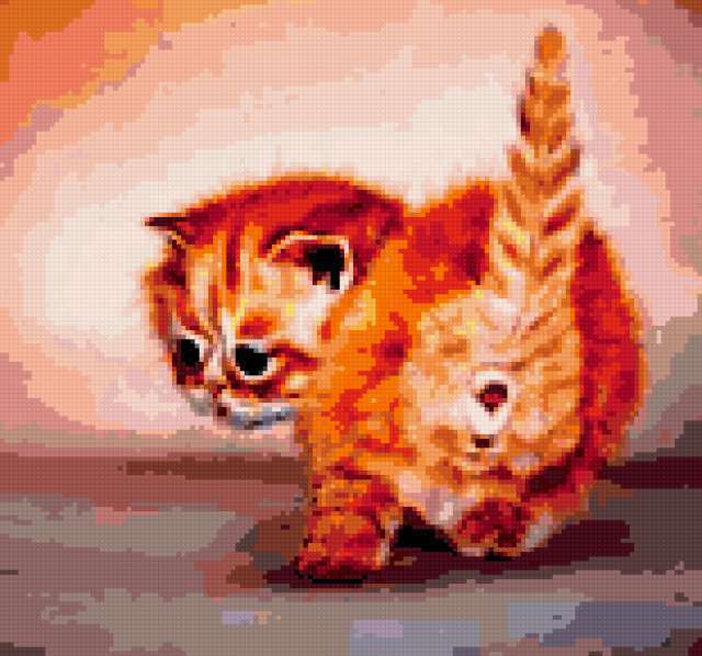 Ориентировочно так, схема вышивки «Котёнок», созданная автором poltanya, будет выглядеть при отшиве на канве. Размер данной вышивки равен 155x145 крестов, при этом используется 39 цветов. Ключевые слова, по которым можно найти эту схему: котёнок, кошки, коты, кошка, животные. Также, вы можете взглянуть на оригинальную картинку, соответствующую данной схеме вышивки.