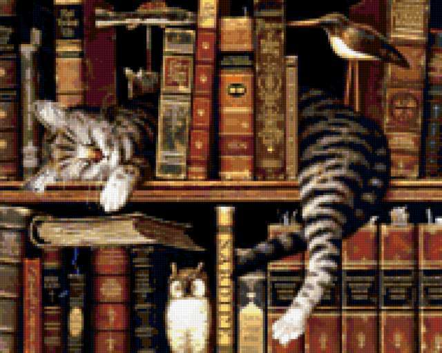 Ориентировочно так, схема вышивки «Кот-библиотекарь», созданная автором sofi-10, будет выглядеть при отшиве на канве. Размер данной вышивки равен 190x152 крестов, при этом используется 66 цветов. Ключевые слова, по которым можно найти эту схему: кот, животные. Также, вы можете взглянуть на оригинальную картинку, соответствующую данной схеме вышивки.