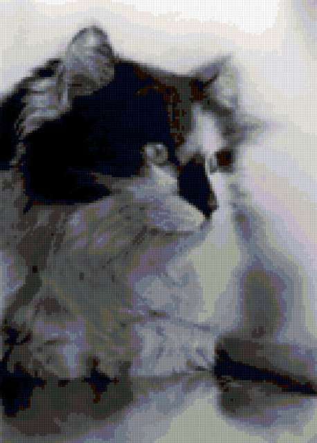 Ориентировочно так, схема вышивки «Кот», созданная автором svobodna-7, будет выглядеть при отшиве на канве. Размер данной вышивки равен 136x190 крестов, при этом используется 26 цветов. Ключевые слова, по которым можно найти эту схему: кот, котик, кошка, грфика, рисунок, вышивка, картина, животные, подарок. Также, вы можете взглянуть на оригинальную картинку, соответствующую данной схеме вышивки.