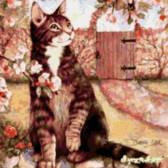 Ориентировочно так, схема вышивки «Кот», созданная автором lilya0505, будет выглядеть при отшиве на канве. Размер данной вышивки равен 180x180 крестов, при этом используется 55 цветов. Ключевые слова, по которым можно найти эту схему: животные, подушка. Также, вы можете взглянуть на оригинальную картинку, соответствующую данной схеме вышивки.