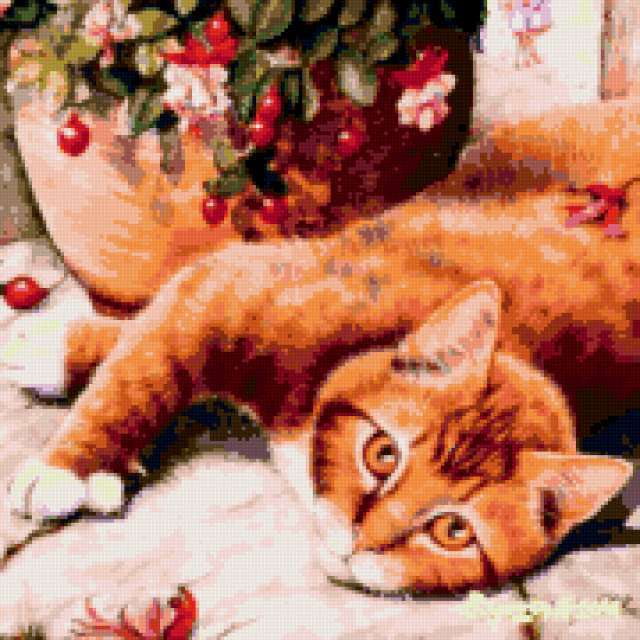 Ориентировочно так, схема вышивки «Кот», созданная автором lilya0505, будет выглядеть при отшиве на канве. Размер данной вышивки равен 180x180 крестов, при этом используется 53 цветов. Ключевые слова, по которым можно найти эту схему: животные, подушка. Также, вы можете взглянуть на оригинальную картинку, соответствующую данной схеме вышивки.