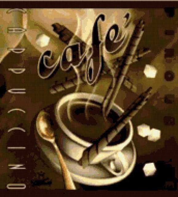 Ориентировочно так, схема вышивки «Кофе 2», созданная автором bellebelle, будет выглядеть при отшиве на канве. Размер данной вышивки равен 172x190 крестов, при этом используется 55 цветов. Ключевые слова, по которым можно найти эту схему: кофе, чашка. Также, вы можете взглянуть на оригинальную картинку, соответствующую данной схеме вышивки.