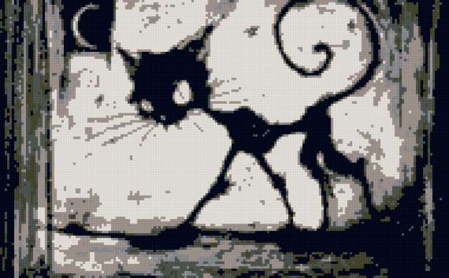 Ориентировочно так, схема вышивки «Кошара», созданная автором mister-maksim201, будет выглядеть при отшиве на канве. Размер данной вышивки равен 190x118 крестов, при этом используется 6 цветов. Ключевые слова, по которым можно найти эту схему: котенок, животные. Также, вы можете взглянуть на оригинальную картинку, соответствующую данной схеме вышивки.
