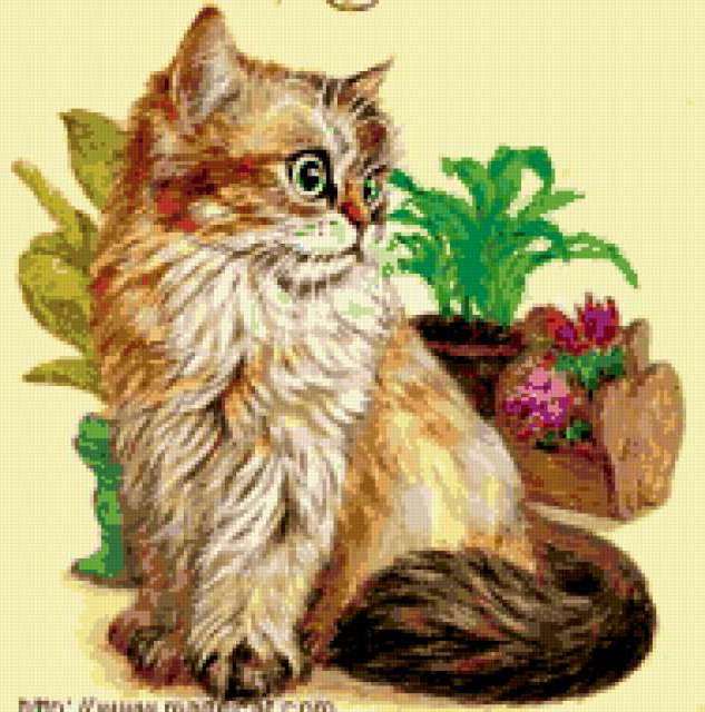 Ориентировочно так, схема вышивки «Кошечка», созданная автором VA903M, будет выглядеть при отшиве на канве. Размер данной вышивки равен 188x190 крестов, при этом используется 48 цветов. Ключевые слова, по которым можно найти эту схему: киса, кошка, котёнок. Также, вы можете взглянуть на оригинальную картинку, соответствующую данной схеме вышивки.