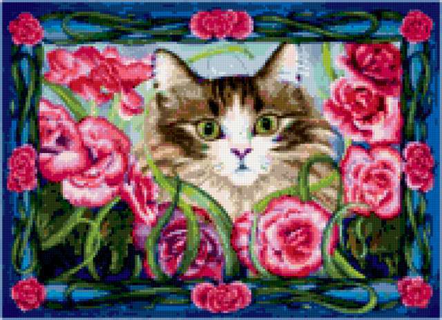 Ориентировочно так, схема вышивки «Кошка в цветах», созданная автором Rin385, будет выглядеть при отшиве на канве. Размер данной вышивки равен 190x138 крестов, при этом используется 75 цветов. Ключевые слова, по которым можно найти эту схему: кошки, животные, картины, кот, цветы. Также, вы можете взглянуть на оригинальную картинку, соответствующую данной схеме вышивки.