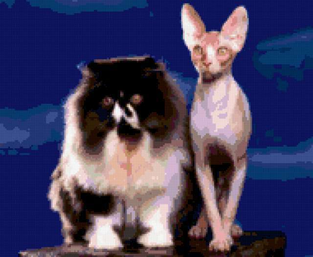 Ориентировочно так, схема вышивки «Кошки 10», созданная автором annyshka_79_79, будет выглядеть при отшиве на канве. Размер данной вышивки равен 190x156 крестов, при этом используется 39 цветов. Ключевые слова, по которым можно найти эту схему: кошки, перс, сфинкс. Также, вы можете взглянуть на оригинальную картинку, соответствующую данной схеме вышивки.