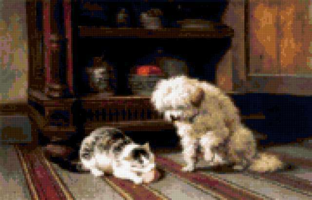 Ориентировочно так, схема вышивки «Кошки 26», созданная автором Starovoitov, будет выглядеть при отшиве на канве. Размер данной вышивки равен 180x116 крестов, при этом используется 57 цветов. Ключевые слова, по которым можно найти эту схему: живопись. Также, вы можете взглянуть на оригинальную картинку, соответствующую данной схеме вышивки.