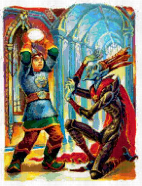 Ориентировочно так, схема вышивки «Кощей бессмертный», созданная автором malkinaiv, будет выглядеть при отшиве на канве. Размер данной вышивки равен 146x190 крестов, при этом используется 87 цветов. Ключевые слова, по которым можно найти эту схему: иллюстрации, сказки, люди, юноша, кощей, детям, в детскую, для детей. Также, вы можете взглянуть на оригинальную картинку, соответствующую данной схеме вышивки.