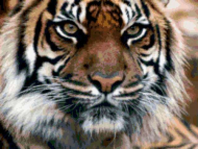 Ориентировочно так, схема вышивки «Красивый тигр», созданная автором inessakisa, будет выглядеть при отшиве на канве. Размер данной вышивки равен 190x143 крестов, при этом используется 75 цветов. К несчастью, автор не назначил для схемы ключевые слова. Также, вы можете взглянуть на оригинальную картинку, соответствующую данной схеме вышивки.