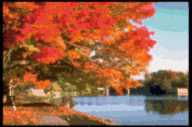 Ориентировочно так, схема вышивки «Краски осени», созданная автором 1970, будет выглядеть при отшиве на канве. Размер данной вышивки равен 190x126 крестов, при этом используется 62 цветов. Ключевые слова, по которым можно найти эту схему: осень, природа. Также, вы можете взглянуть на оригинальную картинку, соответствующую данной схеме вышивки.