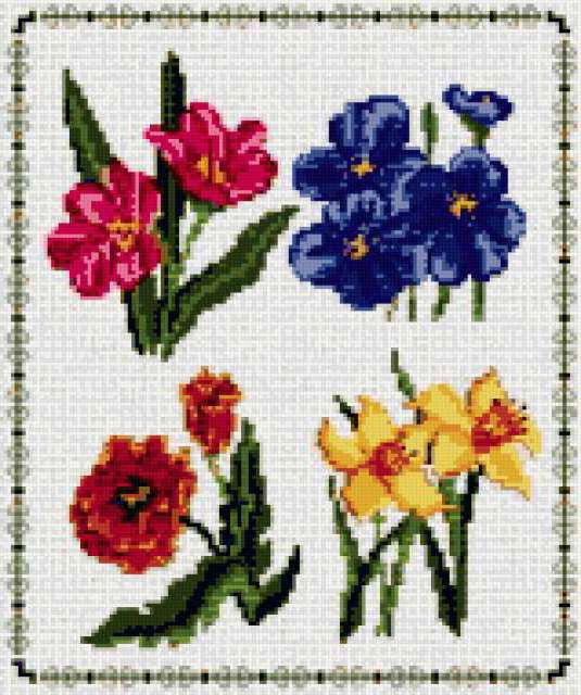 Ориентировочно так, схема вышивки «Краски цветов 9», созданная автором poltanya, будет выглядеть при отшиве на канве. Размер данной вышивки равен 159x190 крестов, при этом используется 36 цветов. Ключевые слова, по которым можно найти эту схему: панно, цветы, мини-вышивки, краски цветов, анютины глазки, весенние цветы, нарциссы, маки, мак. Также, вы можете взглянуть на оригинальную картинку, соответствующую данной схеме вышивки.
