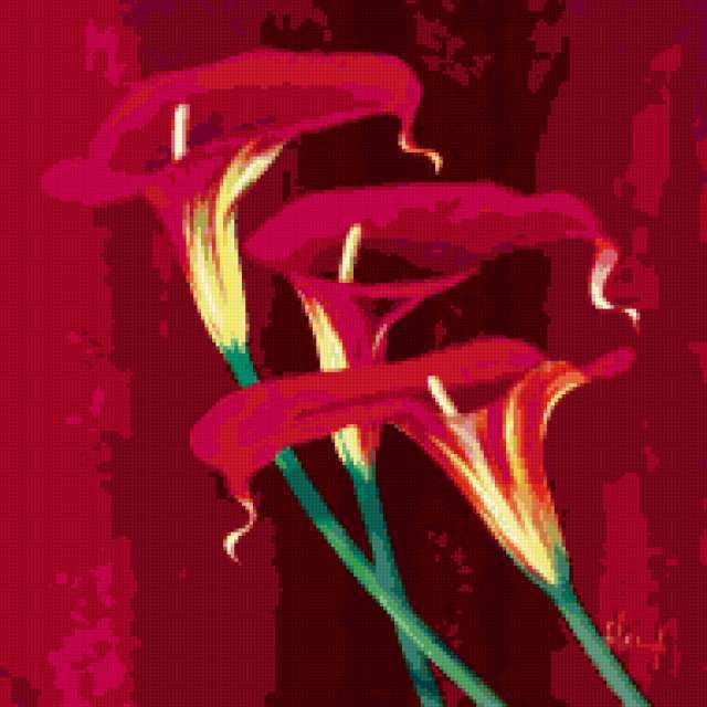 Ориентировочно так, схема вышивки «Красные калы», созданная автором eldi_22, будет выглядеть при отшиве на канве. Размер данной вышивки равен 190x190 крестов, при этом используется 43 цветов. Ключевые слова, по которым можно найти эту схему: калы, цветы, картина, подушка. Также, вы можете взглянуть на оригинальную картинку, соответствующую данной схеме вышивки.