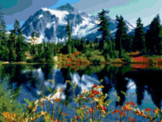 Ориентировочно так, схема вышивки «Красота гор», созданная автором VA903M, будет выглядеть при отшиве на канве. Размер данной вышивки равен 190x143 крестов, при этом используется 70 цветов. Ключевые слова, по которым можно найти эту схему: горы, озеро, пейзаж. Также, вы можете взглянуть на оригинальную картинку, соответствующую данной схеме вышивки.