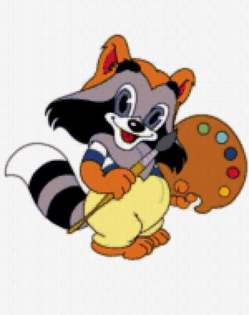 Ориентировочно так, схема вышивки «Крошка Енот», созданная автором Melisenta, будет выглядеть при отшиве на канве. Размер данной вышивки равен 150x190 крестов, при этом используется 65 цветов. Ключевые слова, по которым можно найти эту схему: енот, животные, детям, мультик, сказка, рисунок, крошка енот. Также, вы можете взглянуть на оригинальную картинку, соответствующую данной схеме вышивки.