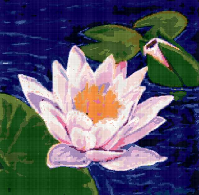 Ориентировочно так, схема вышивки «Кувшинка», созданная автором poltanya, будет выглядеть при отшиве на канве. Размер данной вышивки равен 190x187 крестов, при этом используется 26 цветов. Ключевые слова, по которым можно найти эту схему: кувшинка, лилия, кувшинки, панно, картина, лотос, озеро. Также, вы можете взглянуть на оригинальную картинку, соответствующую данной схеме вышивки.