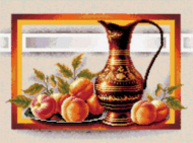 Ориентировочно так, схема вышивки «Кувшин», созданная автором smorodina2410, будет выглядеть при отшиве на канве. Размер данной вышивки равен 190x141 крестов, при этом используется 75 цветов. Ключевые слова, по которым можно найти эту схему: посуда, фрукты. Также, вы можете взглянуть на оригинальную картинку, соответствующую данной схеме вышивки.