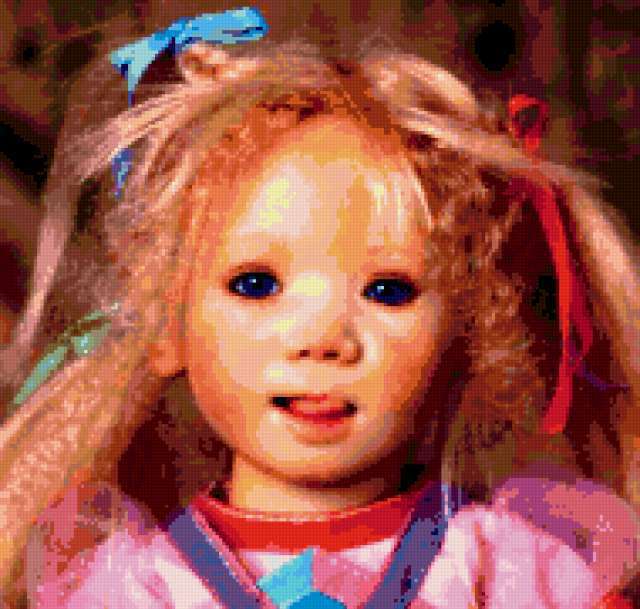 Ориентировочно так, схема вышивки «Кукла», созданная автором dect81, будет выглядеть при отшиве на канве. Размер данной вышивки равен 190x181 крестов, при этом используется 76 цветов. Ключевые слова, по которым можно найти эту схему: кукла, девочка. Также, вы можете взглянуть на оригинальную картинку, соответствующую данной схеме вышивки.