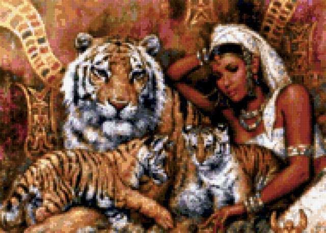 Ориентировочно так, схема вышивки «К.Банг», созданная автором lv-sunflower, будет выглядеть при отшиве на канве. Размер данной вышивки равен 190x136 крестов, при этом используется 66 цветов. Ключевые слова, по которым можно найти эту схему: к.банг, девушка, тигр. Также, вы можете взглянуть на оригинальную картинку, соответствующую данной схеме вышивки.