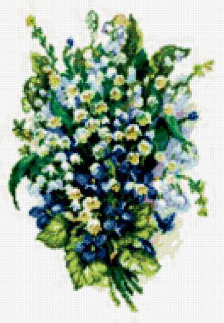 Ориентировочно так, схема вышивки «Ландыши», созданная автором kracota, будет выглядеть при отшиве на канве. Размер данной вышивки равен 132x190 крестов, при этом используется 44 цветов. Ключевые слова, по которым можно найти эту схему: цветы, букет. Также, вы можете взглянуть на оригинальную картинку, соответствующую данной схеме вышивки.
