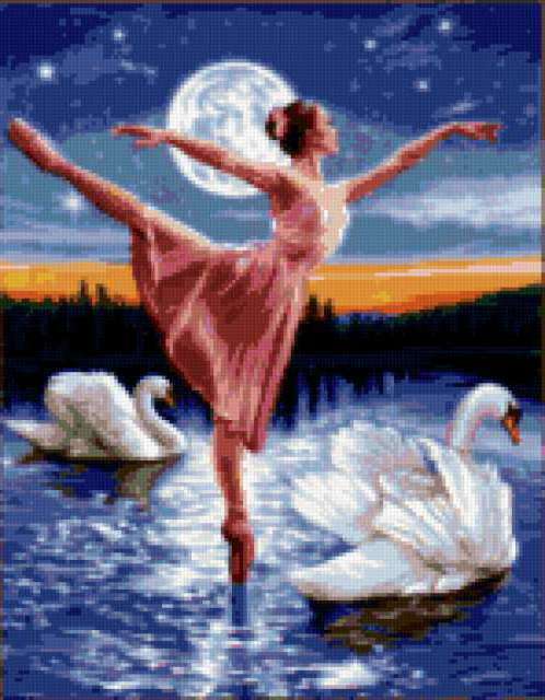 Ориентировочно так, схема вышивки «Лебединое озеро 2», созданная автором VA903M, будет выглядеть при отшиве на канве. Размер данной вышивки равен 148x190 крестов, при этом используется 62 цветов. Ключевые слова, по которым можно найти эту схему: лебеди, балерина, балет, ночь, луна. Также, вы можете взглянуть на оригинальную картинку, соответствующую данной схеме вышивки.