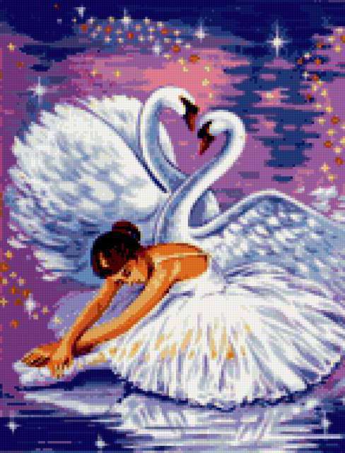 Ориентировочно так, схема вышивки «Лебединое озеро», созданная автором VA903M, будет выглядеть при отшиве на канве. Размер данной вышивки равен 145x190 крестов, при этом используется 45 цветов. Ключевые слова, по которым можно найти эту схему: балет, балерина, лебеди. Также, вы можете взглянуть на оригинальную картинку, соответствующую данной схеме вышивки.
