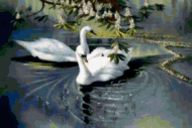 Ориентировочно так, схема вышивки «Лебеди», созданная автором lucha, будет выглядеть при отшиве на канве. Размер данной вышивки равен 190x127 крестов, при этом используется 61 цветов. Ключевые слова, по которым можно найти эту схему: лебеди, пруд, птицы, озеро, природа, пейзаж. Также, вы можете взглянуть на оригинальную картинку, соответствующую данной схеме вышивки.