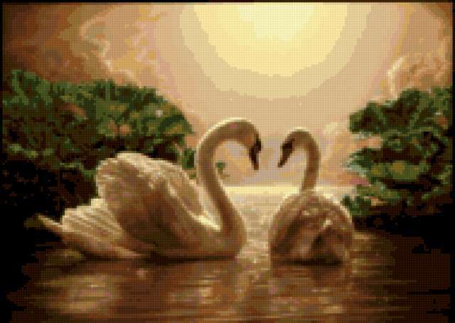 Ориентировочно так, схема вышивки «Лебеди», созданная автором 13197, будет выглядеть при отшиве на канве. Размер данной вышивки равен 190x135 крестов, при этом используется 49 цветов. Ключевые слова, по которым можно найти эту схему: птицы, лебеди, природа, пейзаж, вечер, река. Также, вы можете взглянуть на оригинальную картинку, соответствующую данной схеме вышивки.